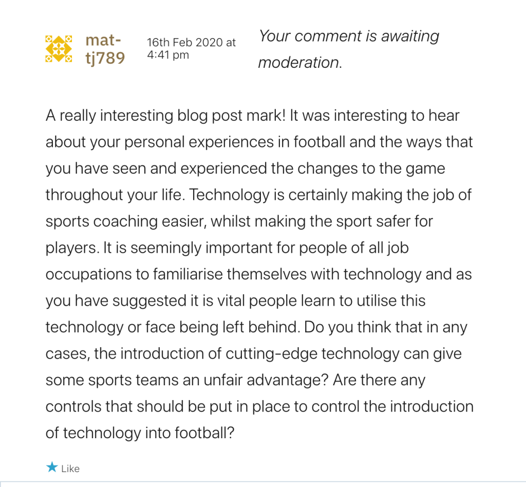 It was useful to hear of Mark’s experiences of football coaching as this was an area where I had not expected technology to have much impact.