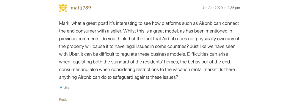 Being able to compare different perspectives on the same issue is a skill I have developed to help me become a better learner. When comparing Roy’s blog on Just Eat with Mark’s on Airbnb, I identified a theme in the problems faced by platform business models concerning regulation. By thinking synoptically, I can now look thematically at problems to help identify solutions.